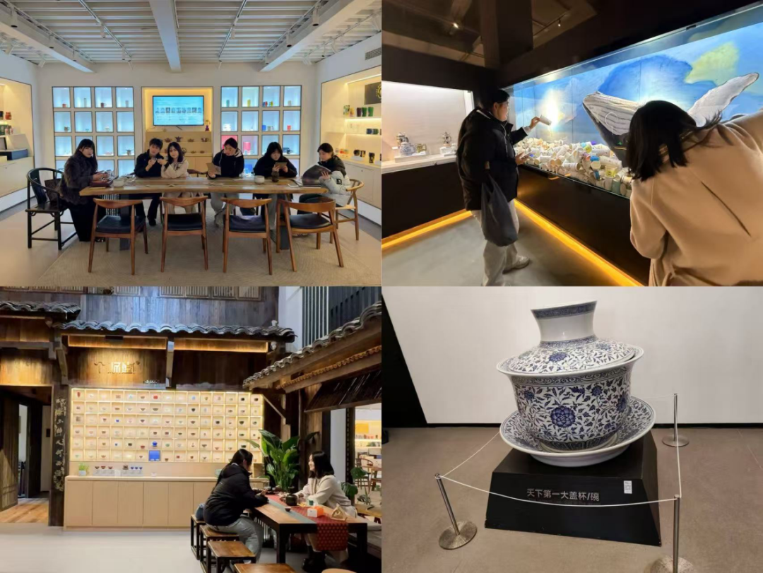 展厅中,直径1.08米的“天下第一大盖杯”引发阵阵惊叹,这件由景德镇匠人历时两年烧制的巨作,让同学们真切体会到“白如玉、明如镜、薄如纸、声如磬”的瓷艺精髓。而用一次性杯子组成的艺术展品“鲸鱼的眼泪”,则以独特视角传递环保理念,让大家在艺术熏陶中深化社会责任意识。在唐宋老街休闲区,古色古香的氛围与氤氲茶香相融,同学们一边观摩茶艺展示,一边聆听“好茶配好杯”的文化常识,亲手体验冲泡流程后,更懂器物与生活的和谐之美。