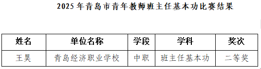 日前,青岛市教育局公布了2025年青岛市班主任基本功比赛结果,经校级推选、市级评审等层层选拔,青岛经济职业学校的王昊老师凭借扎实的专业素养和创新的育人理念,在本次比赛中脱颖而出,荣获二等奖的优异成绩。