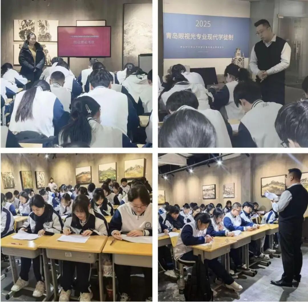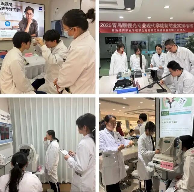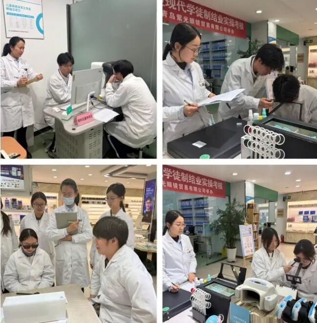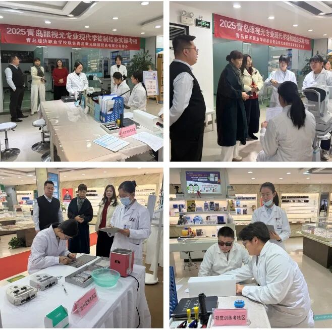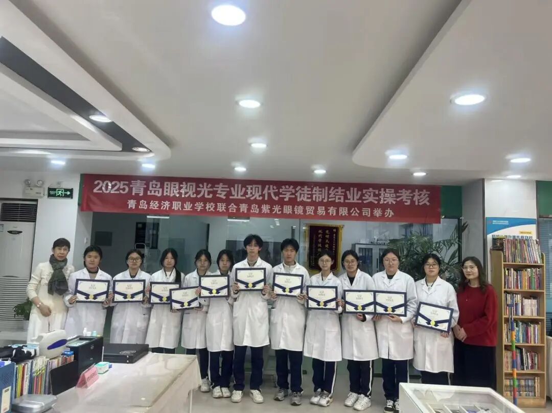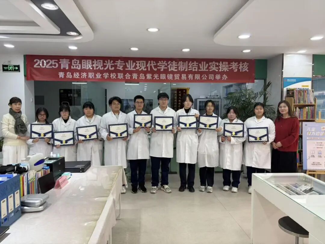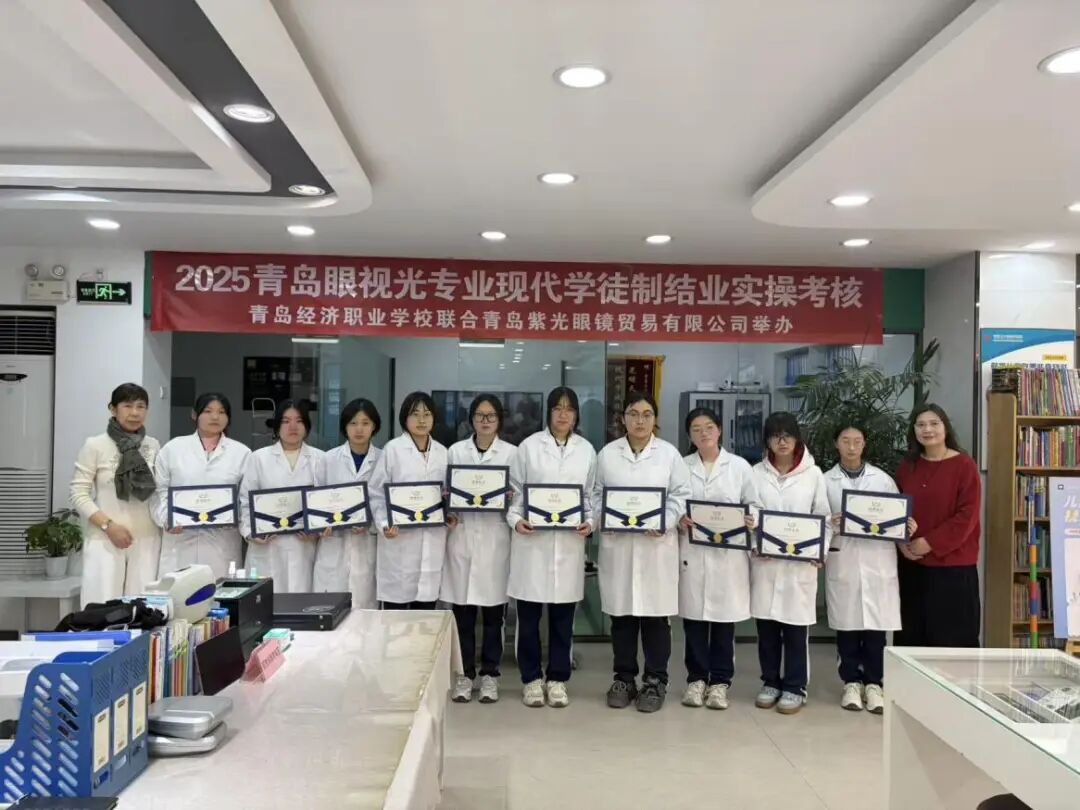 2026年1月23日“青岛经济职业学校 青岛紫光眼镜贸易有限公司 眼视光专业现代学徒制班学期考核”在青岛紫光眼镜贸易有限公司举行。学生每周前三天在学校进行基础性学习,周四、周五走出校园,进入紫光眼镜实训,学徒期一年。