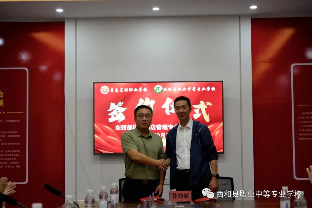 青岛烹饪职业学校校长于越与西和职专校长于景辉代表双方学校签订了酒店管理专业联盟共建协议。