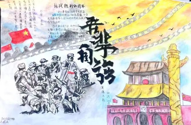 引导同学们铭记峥嵘岁月。通过描绘英雄形象、重要战役、历史遗迹或和平景象,缅怀革命先烈的丰功伟绩,感悟今日和平的来之不易,厚植爱党爱国爱社会主义的深厚情怀,让红色基因代代相传。