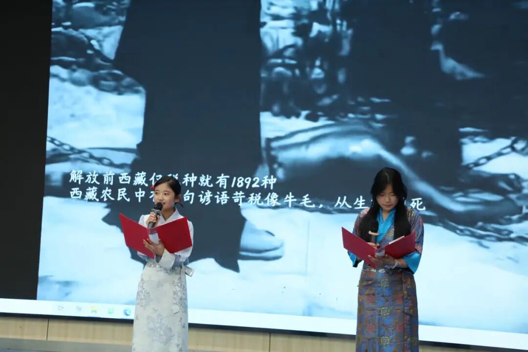 2025级12班的格桑普尺、央金拉姆同学为大家带来的《冲破黑暗,雪域向阳》,鼓励同学们勇敢跨越困境,坚定追逐心中光芒,为雪域大地的美好明天挥洒青春汗水。2025级13班的达瓦扎西、德吉曲珍等同学带来的诗朗诵《我骄傲我是中国人》,激励青少年们怀揣民族自豪感奋进,让大家体会到了身为中国人的豪迈情怀。