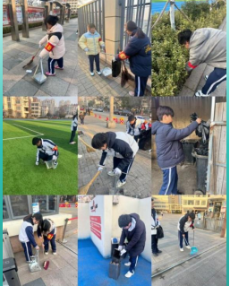 面对困难,2023级7班值周同学没有退缩,而是主动想办法、找对策。每日清晨,天未亮透,值周同学便提前抵达校园,反复清扫校园内和大门口的落叶、纸屑与杂物。积累一个假期难以清理的地面污渍、走廊、楼梯的卫生死角,同学们手提水桶,用抹布一点点擦拭。分工合作清理窗台、墙角、宣传栏的灰尘与污垢;对于卫生间、垃圾站等重点清洁区域,同学们不怕脏、不怕累,轮流值守,反复打扫,确保校园每一处角落干净整洁。