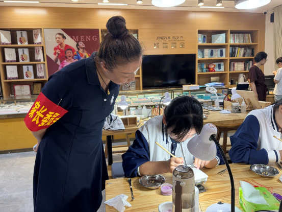 班主任张老师热情地带领我参观校园,详细介绍了学校的校园文化建设。行走在中医药红色文化墙、药廉文化长廊,张老师介绍说,学校结合专业特色打造这些文化场景,就是希望让孩子们在日常行走中,既能感受传统文化的魅力,也能接受红色教育与廉洁教育的熏陶;而在校内产教融合实践中心,从首饰设计图纸到成品制作的全流程展示,从先进的实训设备到学生制作的精美首饰作品,生动呈现了学校“校企合作、产教融合”的办学特色,也让我直观看到了校企共育技能型人才的丰硕成果。在这里,每一处校园景观都蕴含着教育意义,每一个实践场所都为学生成长搭建了平台。这种“文化育人、实践育人”的氛围,让我对学校的教育理念有了更深刻的理解。