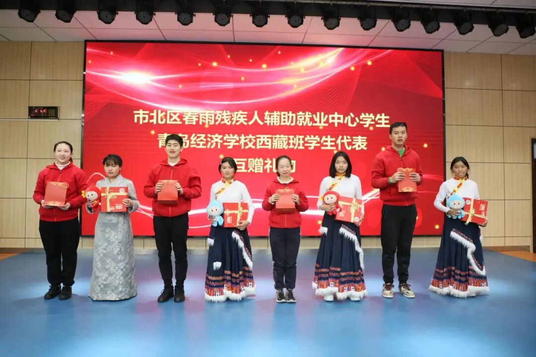 仪式环节,青岛市教育局家庭教育处处长王秀婷为结对教师代表颁发证书。随后,西藏班学生向结对教师敬献哈达,教师回赠暖冬衣物,象征着师生之间深厚的情感纽带与互助关怀。青岛芙蕾雅文化传播有限公司设计总监刘刚与市北区春雨残疾人辅助性就业中心负责人崔永兰共同向西藏班学生捐赠暖冬礼物。春雨中心学生与西藏班学生代表也互赠礼物,传递了彼此鼓励、携手共进的美好心意。