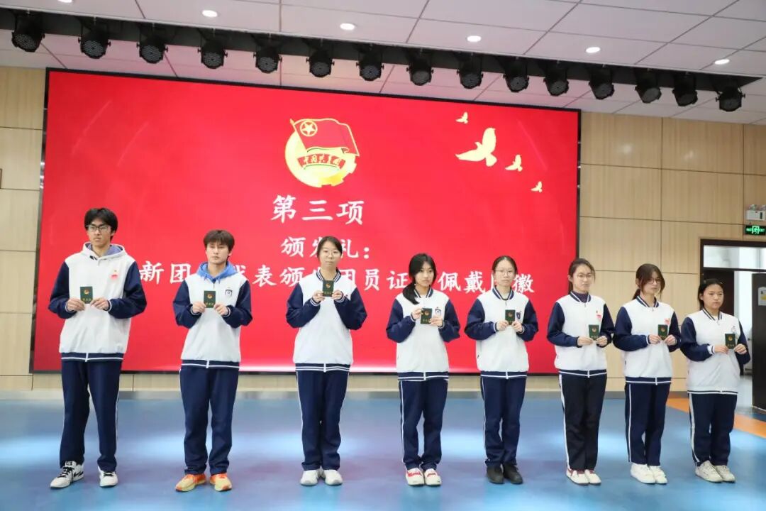 佩戴团徽,扛起责任使命, 老团员代表为新团员佩戴团徽、颁发团员证。当金红相间的团徽定格在左胸,与心脏同频共振,这不仅是身份的更迭,更是责任与使命的接力。希望每名新团员勤奋努力,充分发挥团员模范带头作用,履行团员义务,用实际行动来表示自己无愧于共青团员这个光荣的称号。