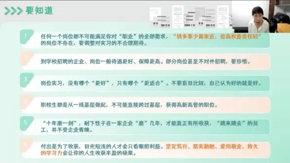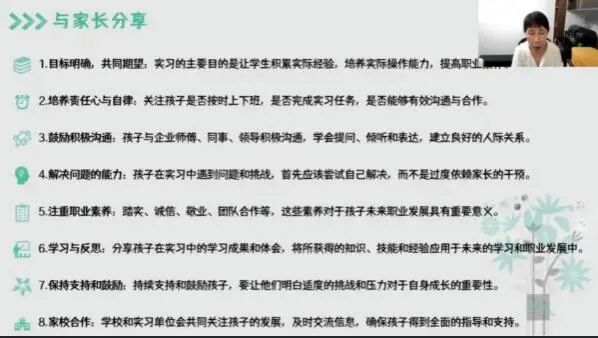 高主任从实习计划安排、实习制度、明确实习概念、实习的几个误区、实习中的一些问题、实习中要知道的问题、实习中安全是首位、让优秀成为一种习惯、成功快乐实习的秘诀、实习前准备、与家长分享等十一个方面57条教育心法,为家长和学生展现了社会、职场的诸多生活和工作画面。提醒同学们提前调整好生物钟,做好迎接岗位实习工作的心理准备,希望家校携手共同做好实习教学工作。