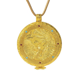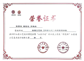 在2025山东工艺美术博览会暨“山东手造”精品展——“荷花杯”山东省工艺美术设计创新大赛中,“经雅黄金”作品以皇家非遗+时尚设计惊艳全场。其中《黄河文脉·敦煌金翼马》从2400件作品中脱颖而出,一举揽获第三届山东省工艺美术设计创新大赛创新创优特等奖。将花丝镶嵌、黄金錾刻等非遗技艺与3D建模、数字化铸造技术相结合,通过0.08毫米金丝双线编织的马鬃、金翼、马鞍,极致精美的满錾毛发与精工镶嵌,既保留了传统工艺的精髓,又融入了现代审美元素。评委专家给予“作品承黄河文脉融敦煌风韵,工艺精致灵动,造型生动舒展”的高度评价。《〈齐鲁仁风〉纯银錾刻水缸》《〈黄河文脉·儒圣昭辉〉摆件》《拍平珐琅——黄财神黄金吊坠》《龙凤宸曜--〈凤栖牡丹〉〈龙腾云瀚》四件作品荣获大赛金奖,《崂山奇景图花瓶》《龙凤呈祥〈凤栖云霓〉〈沧溟龙吟》荣获大赛银奖,《手工岩彩珐琅——扎基拉姆黄金吊坠》获得大赛铜奖。