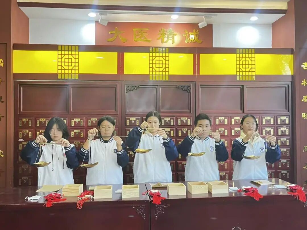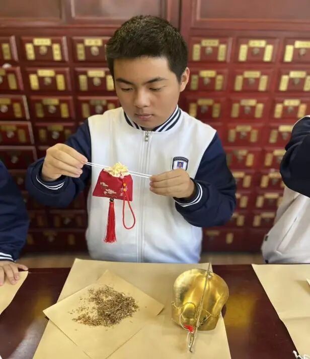 为了此次活动同学们在学校中药房制作了中药香囊,香囊内精心搭配了合欢花、玫瑰花、桂花、百合、陈皮五种中药材,经过称量,研磨等技术更好的激发了中药的香气,淡雅的香气萦绕鼻尖。