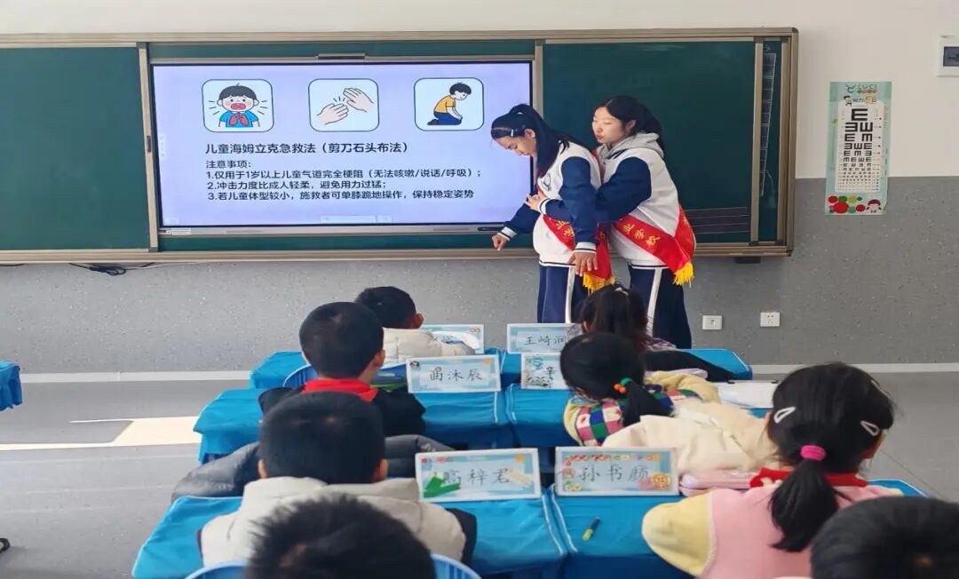 在健康小课堂环节,汉族学生李鑫宇,细致讲解眼球构型,科普近视防控知识,带领孩子们现场练习“一拳一尺一寸”标准坐姿。随后,现场演示和讲解“海姆立克急救法”,通过模拟情景教学,让孩子们初步了解在紧急情况下如何帮助他人,提升自我保护与互助能力。