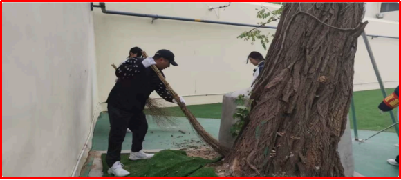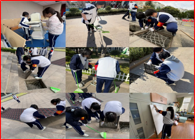同学们分工有序、各司其职:有人弯腰清扫教学楼前落叶,指尖翻飞间将零散枯叶归拢成堆;有人蹲在操场边缘,细致清理草坪中隐藏的塑料杂物;有人手持抹布,反复擦拭宣传栏玻璃,不放过边角一丝污渍。面对凉意,无人抱怨退缩,只有手中加快的动作与心中炽热的责任。