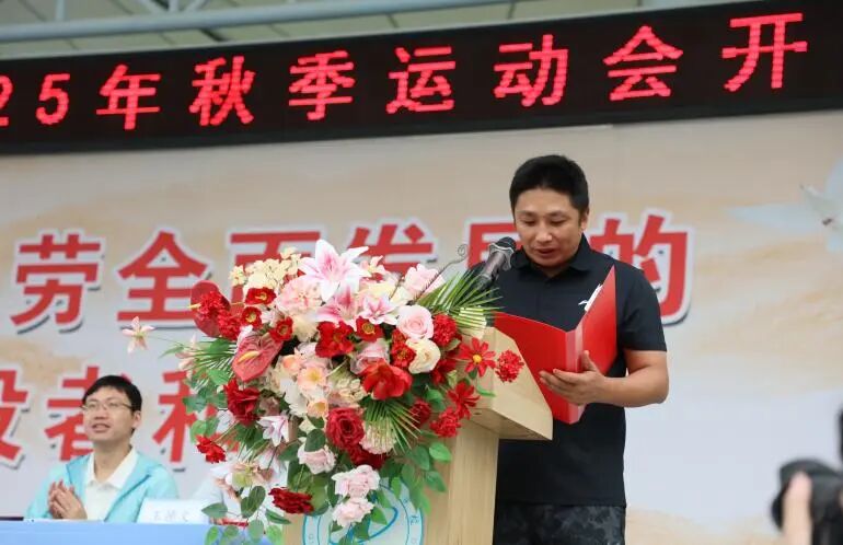 庄严的升旗仪式后,学校党总支书记王建鹏为运动会致开幕辞。他鼓励同学们在赛场上挥洒青春汗水,展现阳光风采,深刻体会体育竞技的魅力,弘扬体育精神,并寄语全体运动员,在比赛中服从裁判指挥,确保自身安全,赛出风格、赛出水平、赛出成绩。裁判员代表马天星老师和运动员代表2024级1班余佳毓同学分别庄严宣誓。