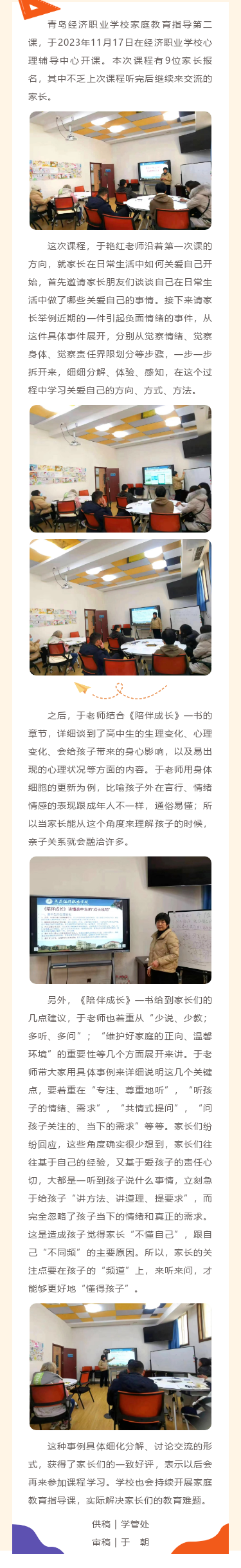 【学情会商·家校面对面】青岛经济职业学校开展家庭教育指导第二课 来源:办公室 发布时间:2023-12-12 浏览次数: 次 【字体:小 大】 青岛经济职业学校家庭教育指导第二课,于2023年11月17日在经济职业学校心理辅导中心开课。本次课程有9位家长报名,其中不乏上次课程听完后继续来交流的家长。 分享到: 【打印正文】