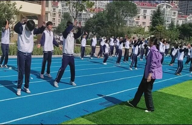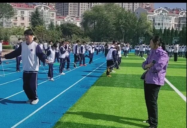 课间操时间,校园里生机勃勃。操场上,高一、高三的同学们整齐地做着广播体操,高二的同学们则在跑道上开展跳绳、开合跳活动,整个校园洋溢着青春的气息。