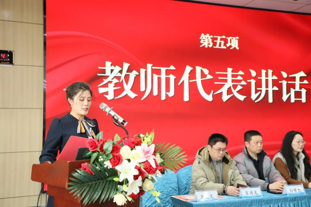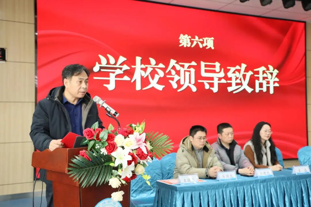 党总支书记王建鹏致辞,回顾了过去一学期学校在技能竞赛、教学科研、五育并举等方面取得的丰硕成果,并对同学们提出三点期许:立大志,以匠心筑梦,将个人成长融入国家发展大局;修品德,以匠心铸魂,涵养自律、诚信、担当品格;强技能,以匠艺立身,在课堂中学、在实训中练、在竞赛中拼。他特别提到今年春晚微音乐剧《每道光》中30位世赛冠军的闪耀时刻,勉励全体师生以奋斗为笔、以梦想为帆,在职教赛道上跑出青春加速度。