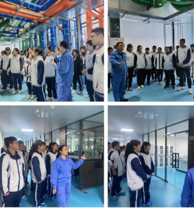 随后同学们分成两组,由生产部李经理和高经理带领同学们来到新建二分厂,大家依次换上鞋套进入生产线,在货运区看到智能立体货架与穿梭车,同学们被机器人的全自动操作震惊,纷纷感叹一定要好好学习专业知识,进入高校继续深造。实验室区域的无机前处理室、气相色谱室、高效液相色谱室也让同学们大开眼界。制水区,多介质罐、活性炭罐等不锈钢设备有序排列,管道与仪表的精密布局,诠释着“科技赋能品质”的严谨,制电设备屋顶的光伏板也让同学们眼前一亮。