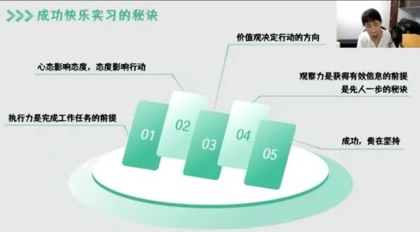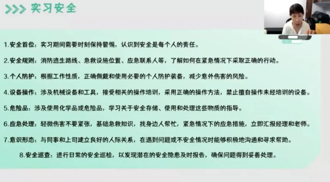 学生感悟:本次培训让我明确了实习规范与安全底线,使我更清晰地认识到:实习培训是起点,岗位实践是核心,考核评优是标尺,材料撰写是沉淀。我会以职业人的标准严格要求自己,在实习历练中收获成长。